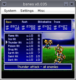 By 2007, I was confident in bsnes' quality, and I was ready to try my next attempt at Bahamut Lagoon. This time, I was able to reprogram the entire game 100% on my own, and after helping Tomato with Mother 3, he agreed to let me use his translation for my new patch.